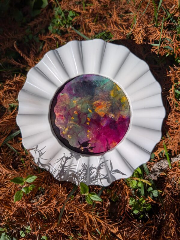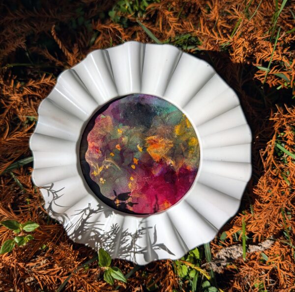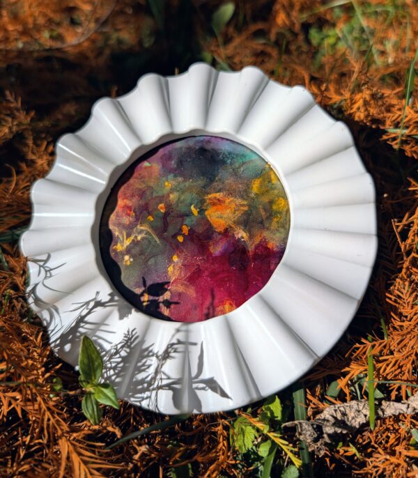 Big things come in small packages! Mixed Media on yupo. 4″ White circle frame. Perfect for a book shelf!